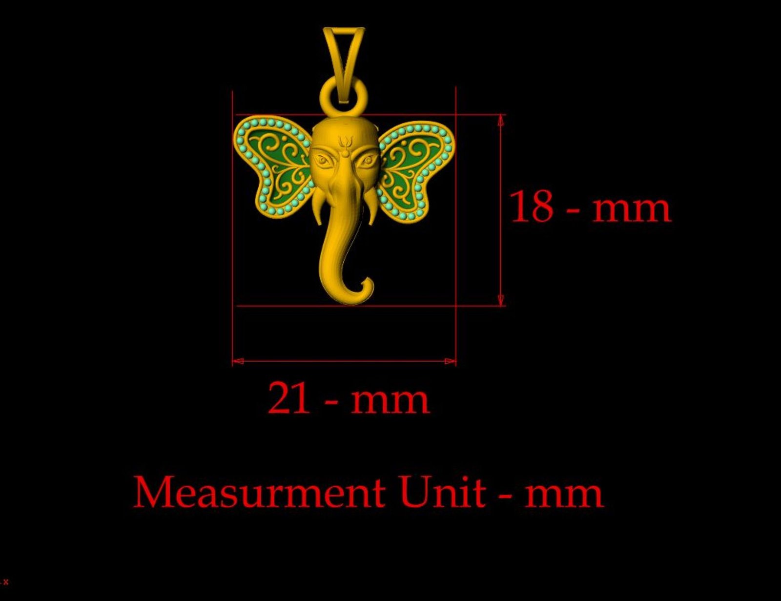 This is a jewelry 3dprint CAD file, STL file. For jewelry CAM and metal casting. Model name is ”Ganpati Pendant - 0045”. And this file is ready for any type of 3Dprinting.We have ” Ganpati Pendant - 0045” length 18-mm,width 21- mm and thickness 6 mm.