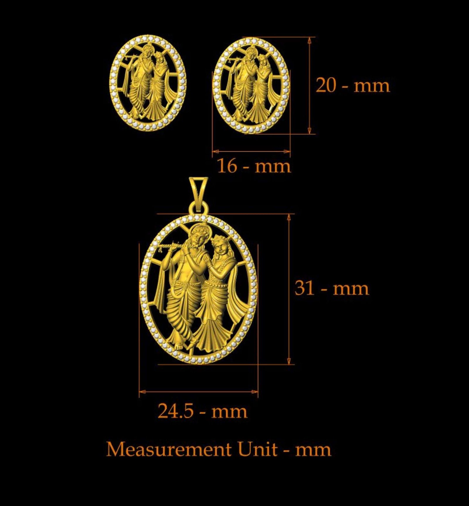 This is a jewelry "Radha Krishna Pendant -0053" 3dprint CAD file, STL file. For jewelry CAM and metal casting. Model name is :- "Radha Krishna Pendant -0053". Radhakrishna can refer to the divine couple of Radha and Krishna from Hinduism. Radha is the chief consort of Krishna, and together they are worshiped as the embodiment of divine love and devotion. The divine Radhakrishna are central figures in many Hindu traditions, representing divine love, devotion, and the ultimate union of the masculine and feminine divine. We have "Radha Krishna Pendant -0053" earring length 20,width – 16 mm and Pendant length 31-mm, width 24.5 mm, thickness 9.5 mm. You can find all details of the product and volume of the product in the image. You can easily calculate any metal weight by product volume. We have given STL, OBJ, 3DMSTL, file format in ZIP file. (After metal casting and filling, and before polishing please tell your pre cutter or stone setter or engraver to clean or deep fece area, cloth and other area of upper portion by jewelry-grain tool or grain bar or other tools for better finishing). We can use this model as a jewelry pendant , Necklace center piece, Earrings, Rings center piece, Showpiece or other purpose. We give you (normal STL, and OBJ) file format in ZIP file.
