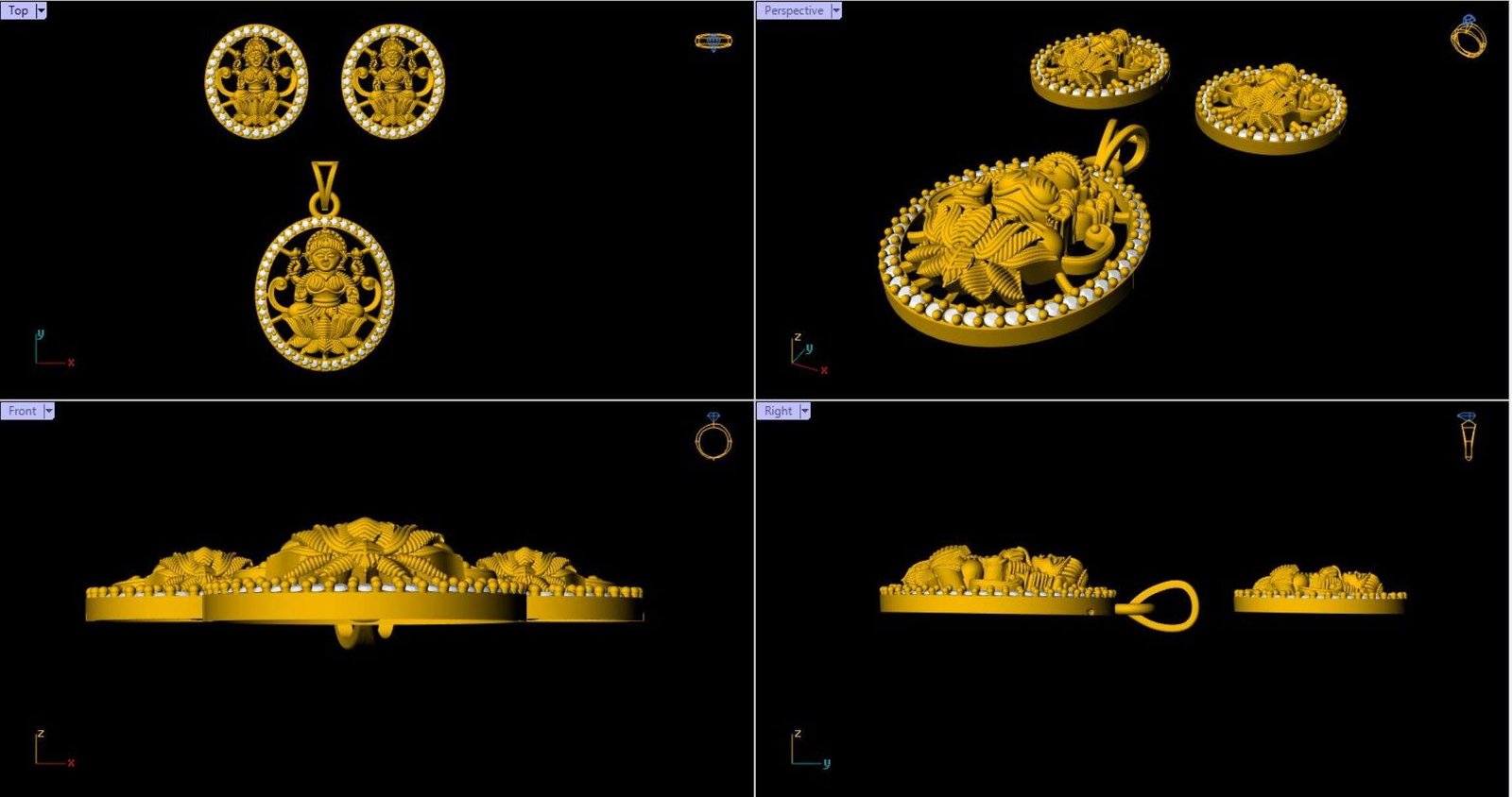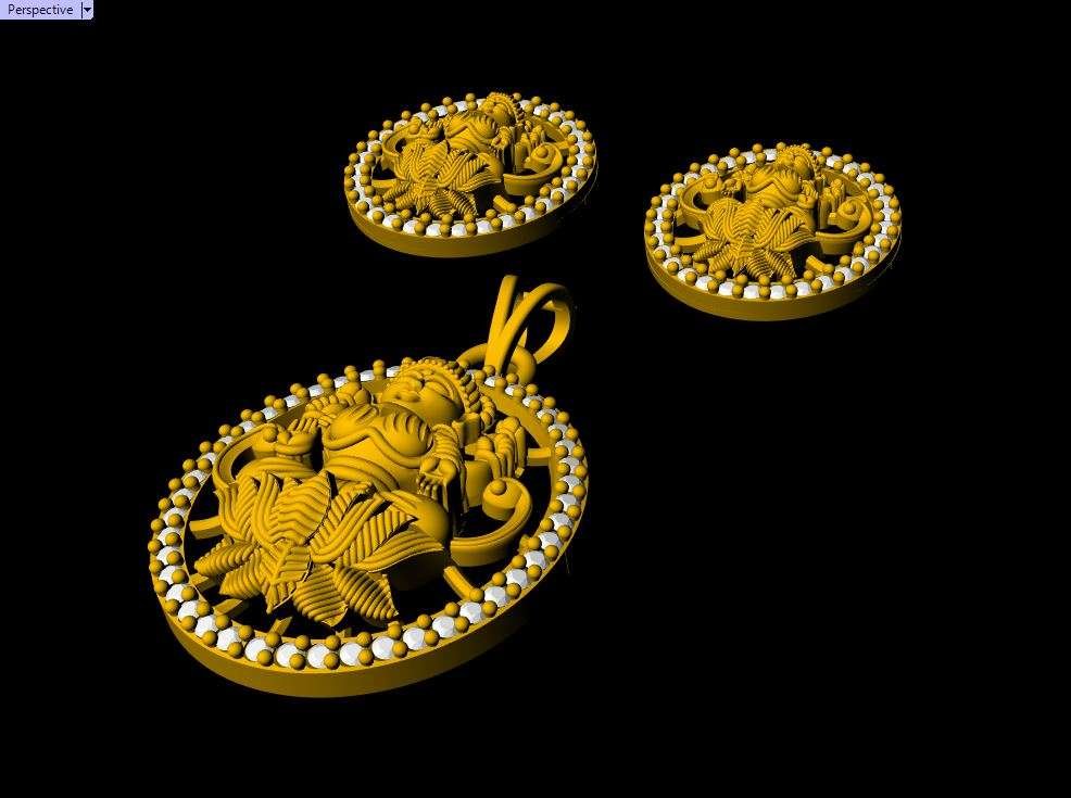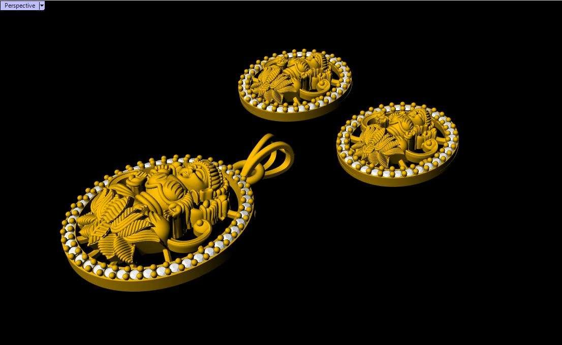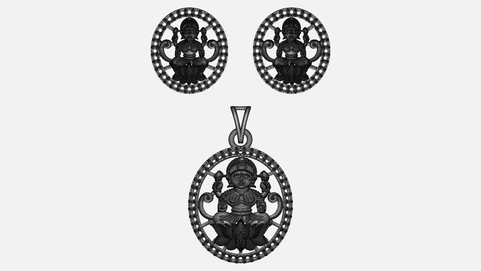 This is a jewelry 3d print file. For jewelry CAM and metal casting. Model name is ”Round Laxmi Pendant Set - 0055”.Lakshmi is the consort of the god Vishnu.
