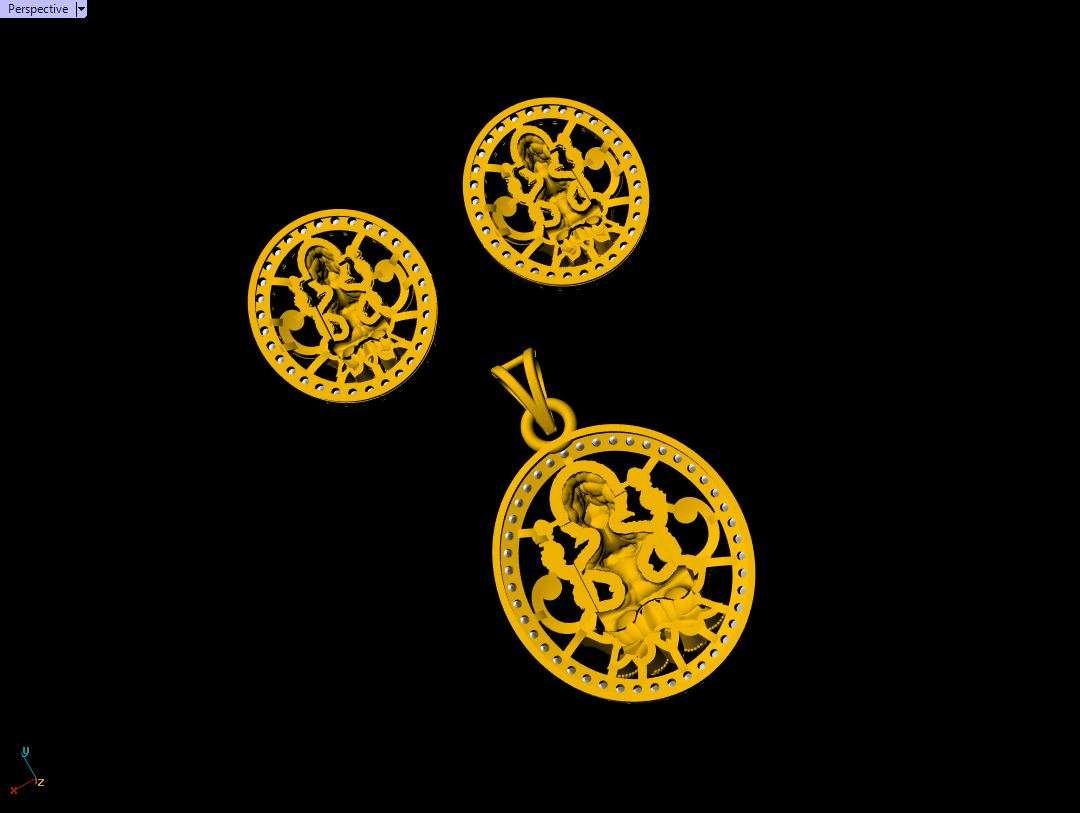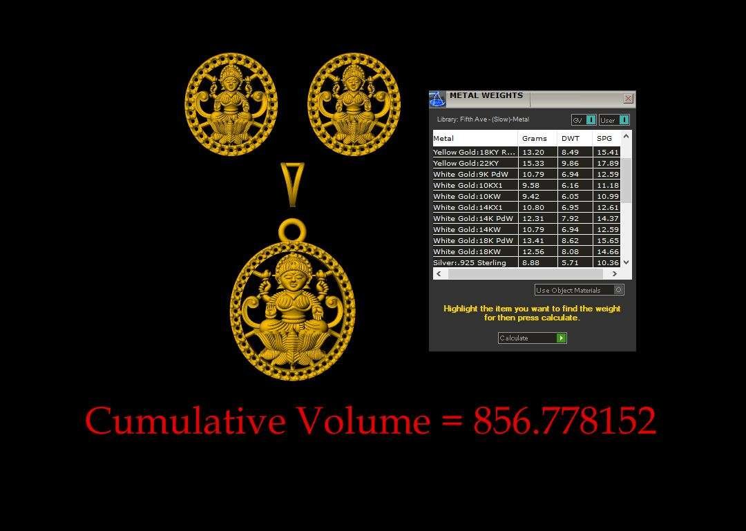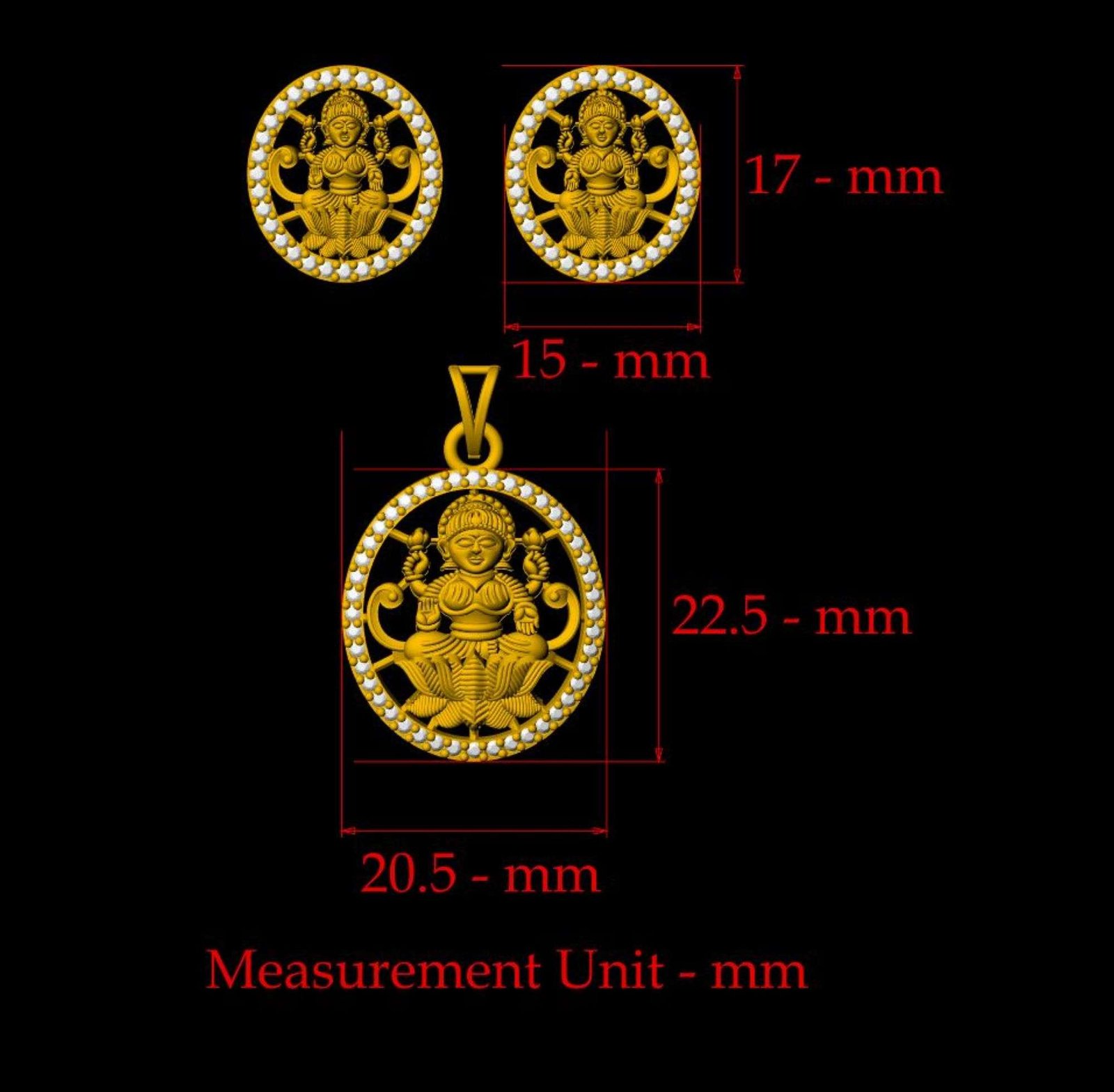This is a jewelry 3d print file. For jewelry CAM and metal casting. Model name is ”Round Laxmi Pendant Set - 0055”.Lakshmi is the consort of the god Vishnu. Lakṣmi, is one of the principal goddesses in Hinduism, revered as the goddess of happiness, fortune, wealth, prosperity, beauty, fertility, sovereignty, and abundance. Lakshmi is commonly portrayed as a beautiful woman with four arms, standing on a lotus flower.” We have ”Round Laxmi Pendant Set - 0055”earring length 17 mm, width 15 mm and pendant length 22.5-mm and width 20.5 –mm and thickness 7 mm . And this file is ready for jewelry CAM and all type of 3Dprint. We can use this model as a Jewelry Pendant, Necklace center piece, Rings center piece, Earrings or other purpose. This ”Round Laxmi Pendant Set - 0055” is ready for jewelry CAM and metal casting and any type of 3D-printing purpose. You can find all details of the product and volume of the product in the image. You can easily calculate any metal weight by product volume. We have given STL, OBJ, 3DMSTL, file format in ZIP file. (After metal casting and filling, and before polishing please tell your pre cutter or stone setter or engraver to clean or deep fece area, cloth and other area of upper portion by jewelry-grain tool or grain bar or other tools for better finishing). We give you (normal STL, and OBJ) file format in ZIP file.